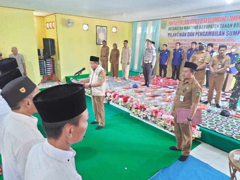 Panitia Pemilihan Kepala Desa Gelombang 1 Tahun 2023 Kecamatan Mantewe, Kabupaten Tanah Bumbu, Kalimantan Selatan Menggelar Pelantikan dan Pengambilan Sumpah Kelompok Penyelenggara Pemungutan Suara (KPPS).