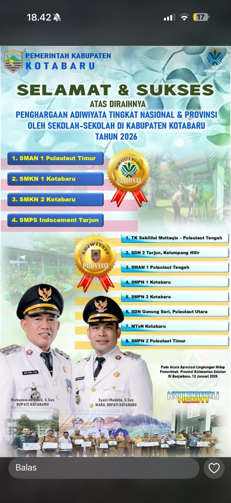 Berikut Sekolah di wilayah Kabupaten Kotabaru yang menerima Penghargaan Sekolah Adiwiyata Tahun 2025, adalah sebagai berikut :