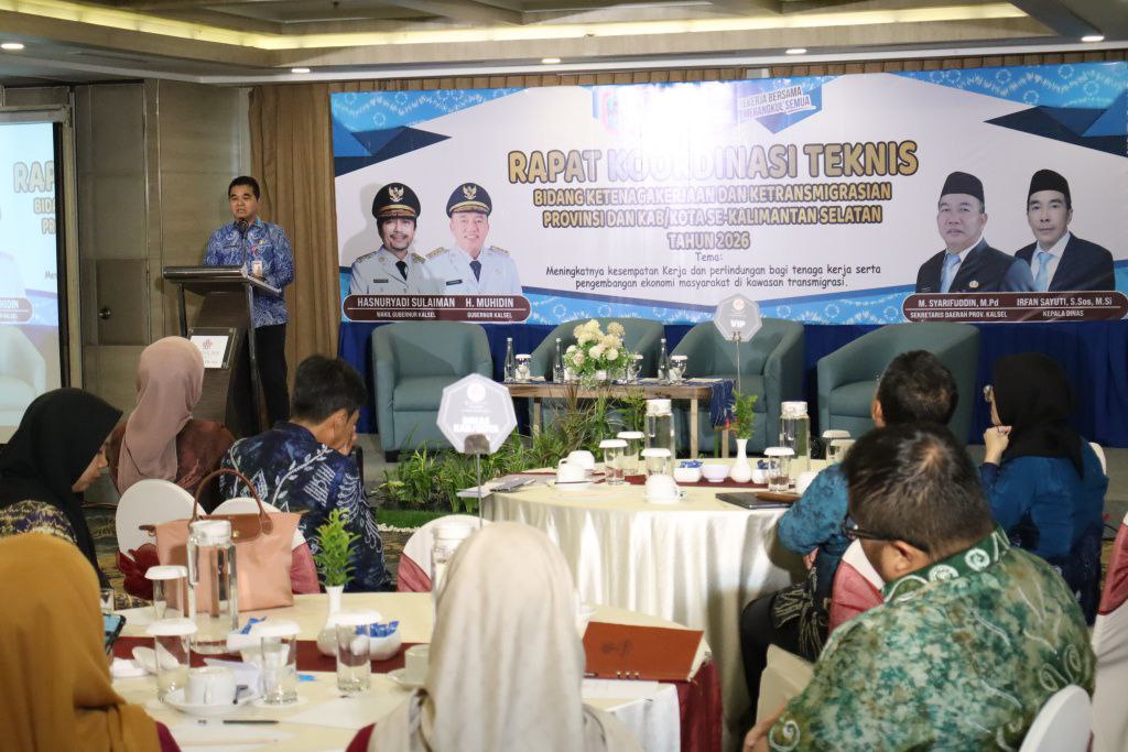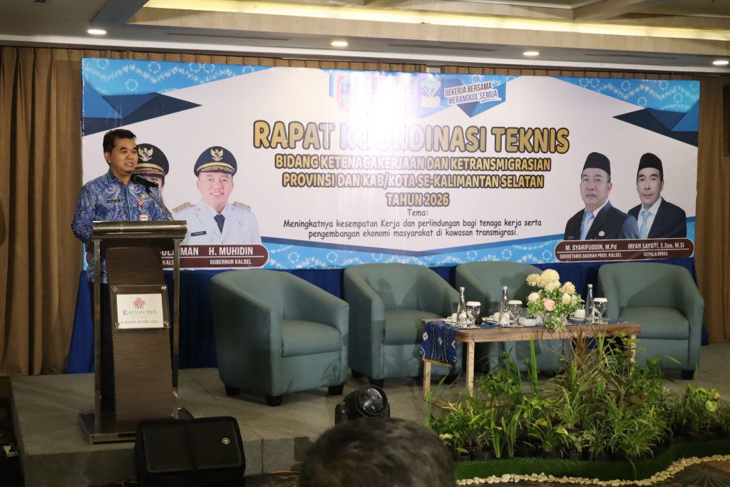 Hal tersebut disampaikan Sekretaris Daerah Provinsi Kalimantan Selatan, Muhammad Syarifuddin, yang diwakili oleh Staf Ahli Gubernur Bidang Ekonomi dan Pembangunan, Miftahul Chair, saat membuka Rapat Koordinasi Teknis (Rakornis) Bidang Ketenagakerjaan dan Ketransmigrasian Provinsi dan Kabupaten/Kota se-Kalimantan Selatan Tahun 2026, di salah satu hotel di Banjarmasin, Kamis (29/1/2026).