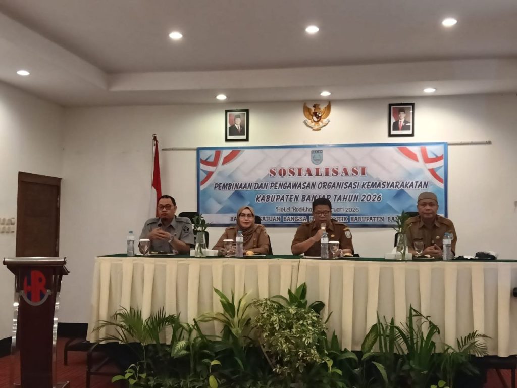 Kepala Bidang Ketahanan Ekonomi, Sosial, Budaya, Agama, dan Organisasi Kemasyarakatan Badan Kesatuan Bangsa dan Politik Provinsi Kalimantan Selatan, Sundusiah, mewakili Kepala Badan Kesatuan Bangsa dan Politik Provinsi Kalimantan Selatan, Heriansyah, menjadi narasumber pada Kegiatan Sosialisasi Pembinaan dan Pengawasan Organisasi Kemasyarakatan (Ormas) Kabupaten Banjar.