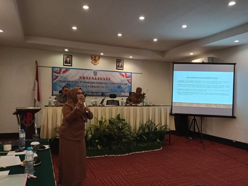 Kepala Bidang Ketahanan Ekonomi, Sosial, Budaya, Agama, dan Organisasi Kemasyarakatan Badan Kesatuan Bangsa dan Politik Provinsi Kalimantan Selatan, Sundusiah, mewakili Kepala Badan Kesatuan Bangsa dan Politik Provinsi Kalimantan Selatan, Heriansyah, menjadi narasumber pada Kegiatan Sosialisasi Pembinaan dan Pengawasan Organisasi Kemasyarakatan (Ormas) Kabupaten Banjar.