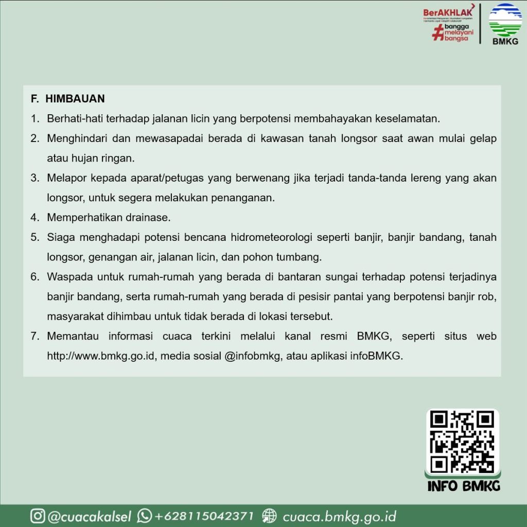 “Kami mengimbau masyarakat berhati-hati terhadap jalan licin, potensi banjir, tanah longsor, pohon tumbang, serta aktif memantau informasi cuaca terkini melalui aplikasi Info BMKG, laman resmi https://cuaca.bmkg.go.id/, dan Instagram @cuacakalsel,” tukasnya. MC Kalsel/Fuz
