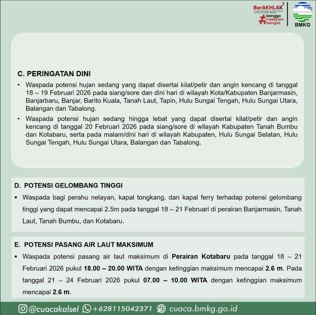 BMKG juga mengeluarkan peringatan dini potensi hujan sedang yang dapat disertai kilat/petir dan angin kencang pada 18–19 Februari di sejumlah kabupaten/kota, serta potensi hujan sedang hingga lebat pada 20 Februari di Tanah Bumbu dan Kotabaru pada siang/sore hari, dan di wilayah hulu sungai pada malam hingga dini hari.