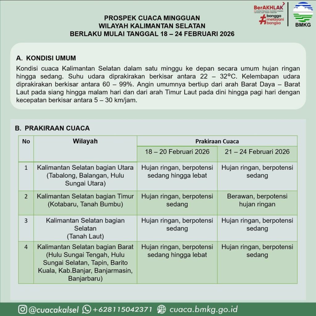 Kepala BMKG Stasiun Meteorologi Syamsudin Noor, Ota Welly Jenny Thalo, melalui prakirawati Bayu Kencana Putra, menyampaikan prospek cuaca mingguan wilayah Kalimantan Selatan yang berlaku 18–24 Februari 2026 (update 17 Februari 2026).