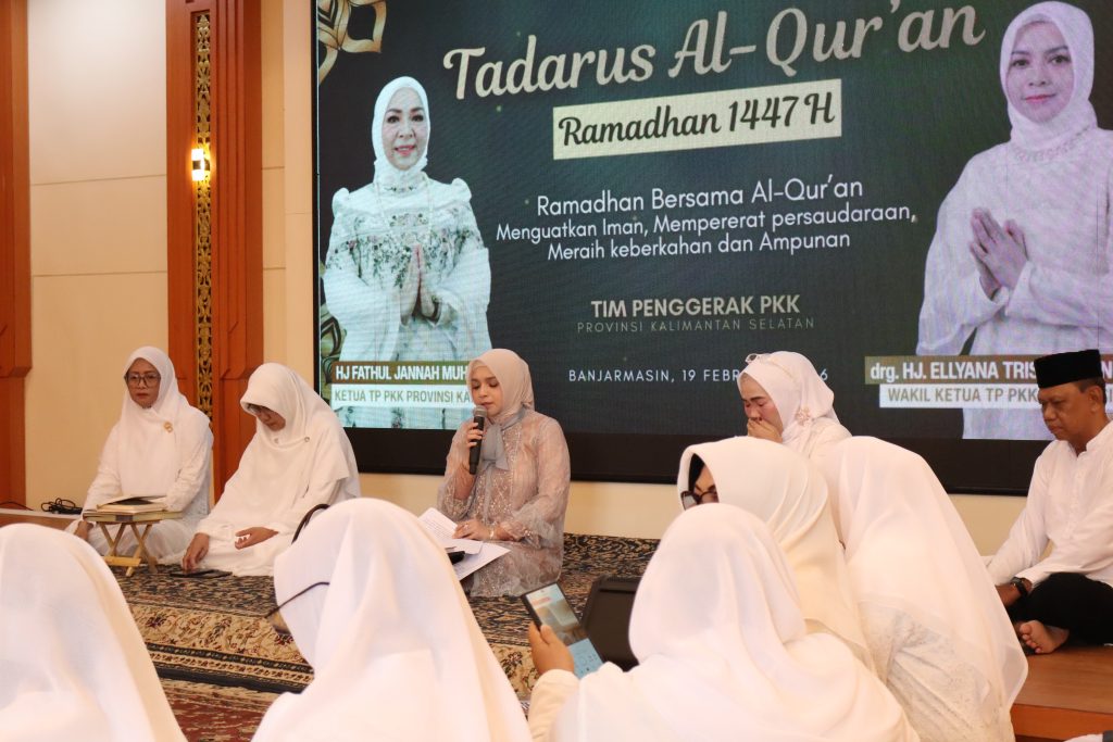 Wakil Ketua Tim Penggerak PKK Provinsi Kalimantan Selatan, drg. Ellyana Trisya, menyampaikan pentingnya menjadikan Al-Quran sebagai pedoman hidup dalam sambutannya pada kegiatan tadarus Al-Quran TP PKK Kalsel di Aula Sasangga Banua Eks Kantor Gubernur Kalsel, Banjarmasin, Kamis (19/2/2026).