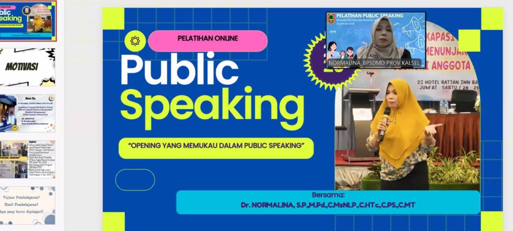Pemerintah Provinsi Kalimantan Selatan melalui Badan Pengembangan Sumber Daya Manusia Daerah Provinsi Kalimantan Selatan (BPSDMD) Provinsi Kalsel menggelar Pelatihan Public Speaking bagi ASN lingkup Pemerintah Provinsi Kalimantan Selatan.