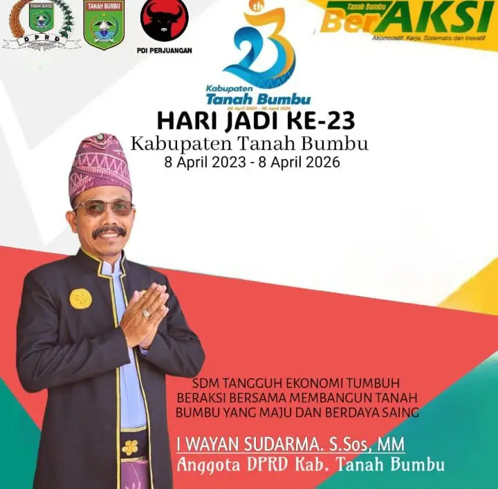 “Selamat Hari Jadi ke-23 Kabupaten Tanah Bumbu. Semoga daerah ini terus berkembang, semakin maju, dan mampu meningkatkan kesejahteraan seluruh masyarakat,” ujar I Wayan Sudarma.