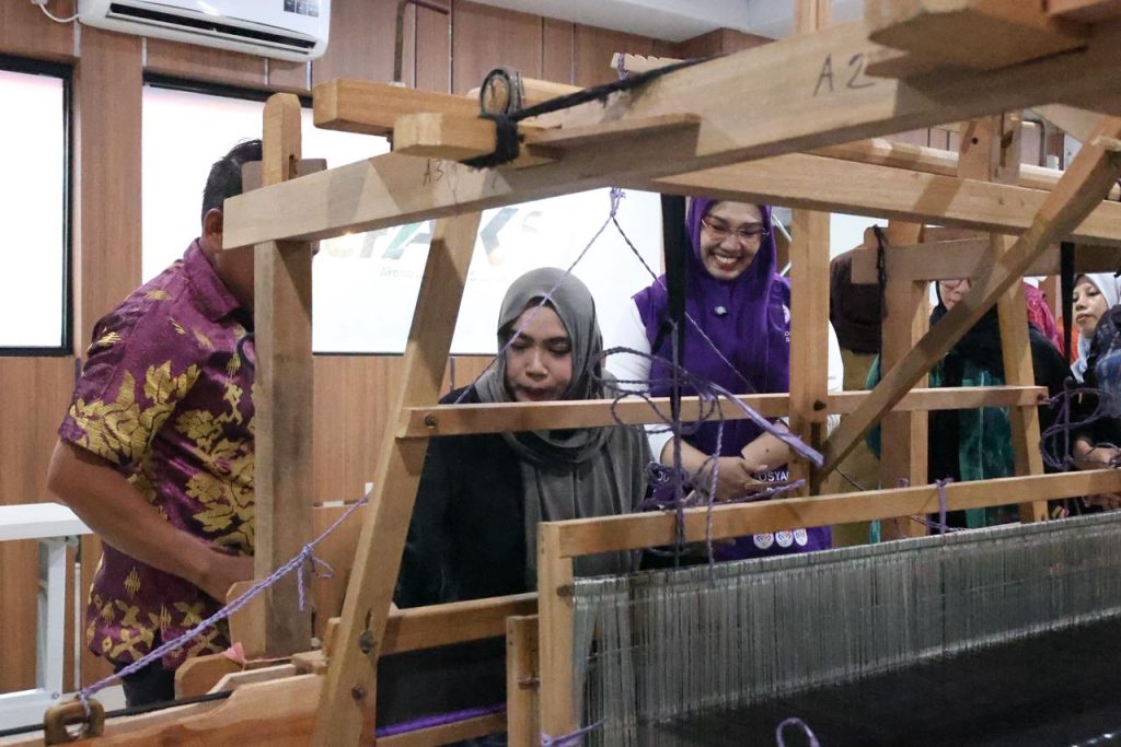 Tak hanya membeli kain tenun pagatan, Ketua Dekranasda Kabupaten Banjar Nurgita Tiyas di dampingi Ketua Dekranasda Tanah Bumbu Andi Irmayani juga mencoba langsung bagaimana proses pembuatan kain tenun Pagatan. (Mil)