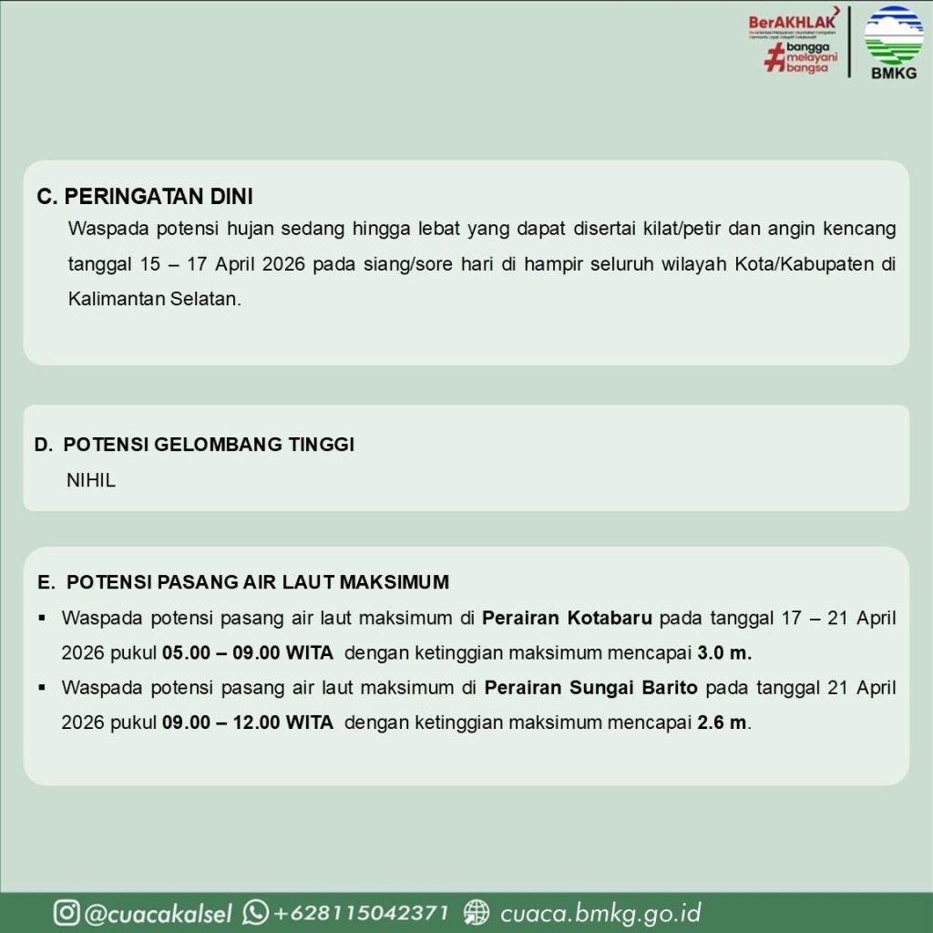 BMKG juga mengeluarkan peringatan dini terkait potensi hujan sedang hingga lebat yang dapat disertai kilat atau petir serta angin kencang, khususnya pada siang hingga sore hari di hampir seluruh wilayah kabupaten/kota di Kalimantan Selatan pada periode 15–17 April 2026.